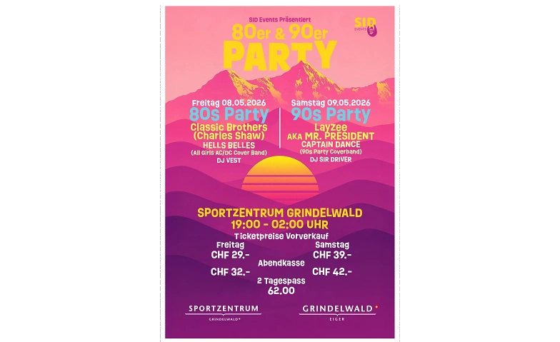 90er Party Samstag | Saturday, 09.05.2026, 19:00 | Sportzentrum Grindelwald, 3818 Grindelwald, CH | Tickets | |