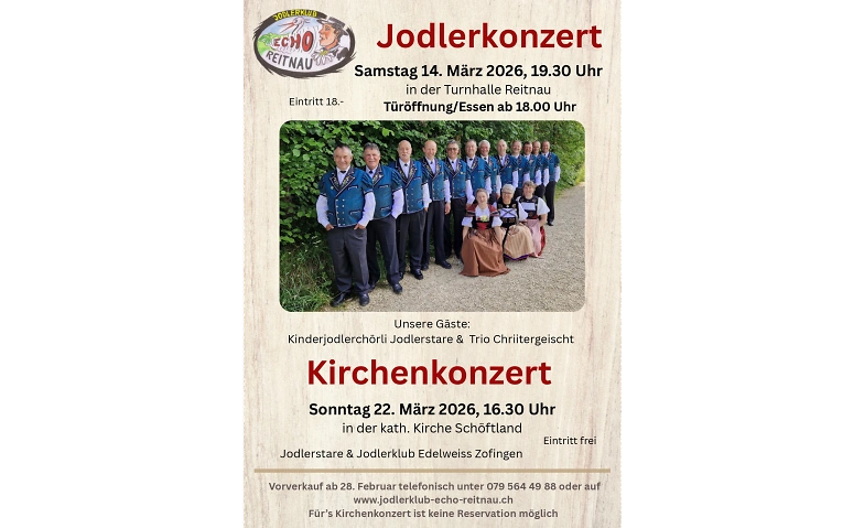 Konzert: Echo Reitnau & Jodlerklub Edelweiss Zofingen | Sunday, 22.03.2026, 16:30 | Katholische Kirche, 5040 Schöftland, CH | Infomation | |