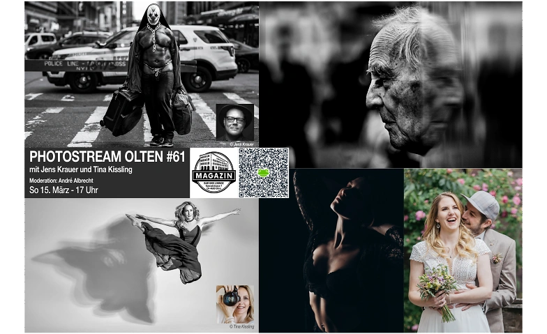 Der Street- und Dokumentarfotograf Jens Krauer und die Porträtfotografin Tina Kissling sind die Gäste des PHOTOSTREAM OLTEN #61. Der Anlass zeigt, wie unterschiedlich fotografische Herangehensweisen sein können: von der unaufdringlichen Beobachtung im öffentlichen Raum bis zur bewusst gestalteten Begegnung vor der Kamera. Zwei Positionen, die exemplarisch für verschiedene fotografische Haltungen stehen und Einblick in ihre jeweilige Praxis geben.