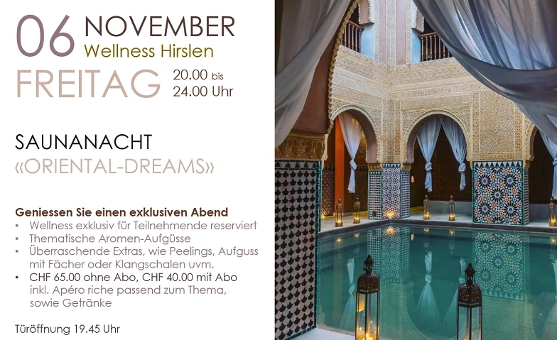 Erleben Sie einen exklusiven Wellness-Abend im orientalischen Stil! Die Saunanacht «Oriental Dreams» bietet thematische Aroma-Aufgüsse, wohltuende Extras wie Peelings oder Klangschalenmomente sowie einen passenden Apéro inklusive Softgetränken und Welcome-Drink. Unsere Saunameisterin führt Sie durch den Abend. Tauchen Sie ab in ein besonderes Saunaerlebnis zum Entspannen und Geniessen.