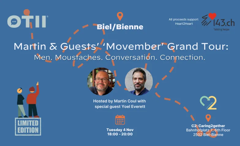This Movember, Martin Coul, host of The Hushed® podcast, brings the Grand Tour to Biel for an evening of open dialogue on men’s mental health. Drawing on his own lived experiences and his work tackling conversations many shy away from, Martin creates the kind of fireside atmosphere where real stories, honest questions, and unexpected laughter spark genuine connection. Each stop also features a special guest to help open up the conversation.