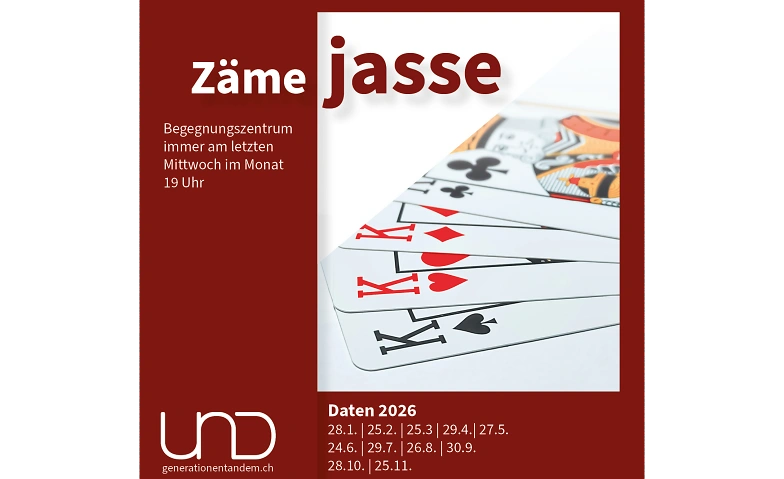 Am letzten Mittwoch im Monat, von 19.00 bis 22.00 Uhr, treffen wir uns im Begegnungszentrum Höchhus zum gemeinsamen Jassen – offen, unkompliziert und für alle geeignet. Vorwissen ist nicht nötig: Du kannst das Jassen neu lernen, alte Kenntnisse auffrischen oder einfach einen gemütlichen Spielabend geniessen.