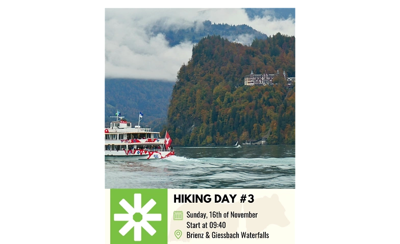 ESN Bern is going on another hike to enjoy the last moments of fall this year! We’ll take a boat to the charming village of Iseltwald and hike from there along the beautifully turquoise Lake Brienz, stopping to visit the Giessbach Falls on the way. Join us for a day of hiking, a peaceful pause in nature before winter arrives, and great company!