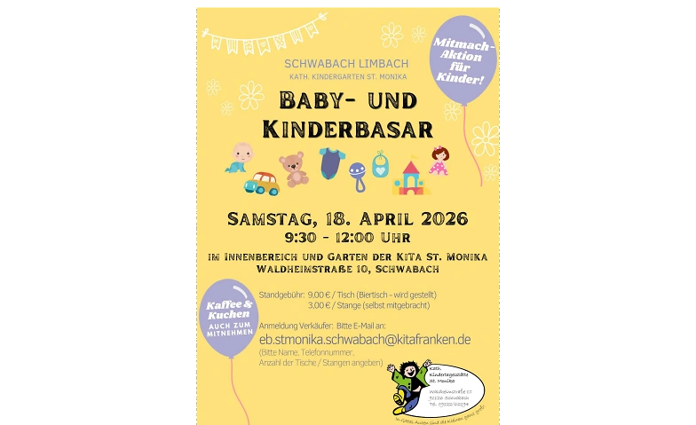 Sichert euch schon jetzt eueren Platz beim diesjährigen Baby- und Kinderbasar im Kindergarten St. Monika (Schwabach-Limbach) am 18.04.2026!