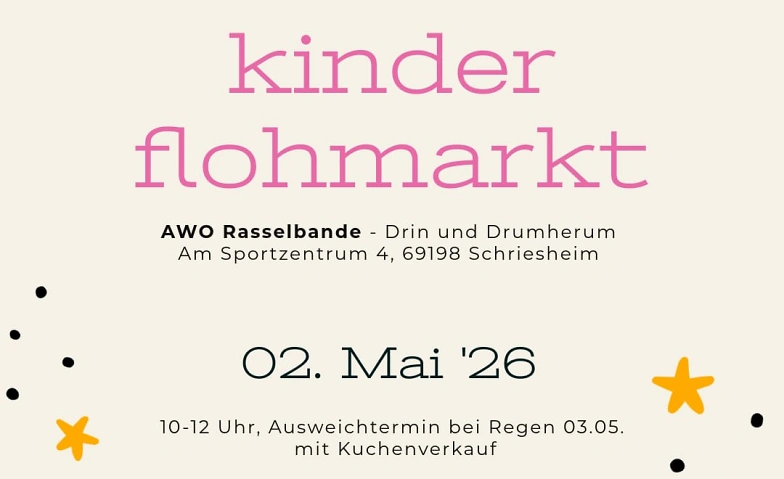 Wenn das Wetter den Open-Air-Flohmarkt nicht zulässt, wird dieser auf Sonntag, 03.05.26 10-12 Uhr, verschoben. Wir sind ein Open-Air-Flohmarkt für wetterfeste Verkäuferinnen und Verkäufer. Eine Verschiebung auf den Ausweichtermin erfolgt nur bei starkem Regen/Unwetter. Leichte Schauer nehmen wir hin. Bitte stellt euch hierauf ein und nehmt ggf. einen Regenschutz (Plane etc.) mit. Für den Fall, dass wir wirklich verschieben müssen geben wir das hier auf der Seite und ggf. per Email bekannt.