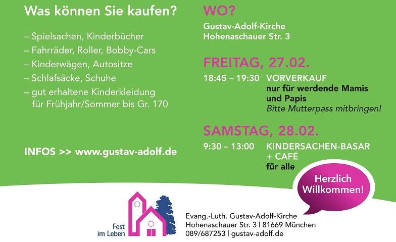 Stöbern, Ratschen, Shoppen, Schlemmen - Schnäppchenjagd mit Erfolgsgarantie! Bei uns ist alles sortiert – kein lästiges Gewühle. Neugierig? Hier sind Sie genau richtig: Kindersachen-Basar am Samstag, 28. Februar 2026 in der Gustav-Adolf Gemeinde in München-Ramersdorf von 9.30 Uhr bis 13.00 Uhr.