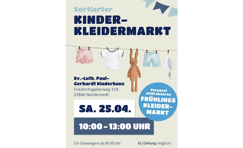 Am Samstag, den 25.04.26 von 10-13 Uhr findet der sortierte Kinderkleidermarkt im Paul-Gerhardt Kinderhaus in Norderstedt statt. Für Schwangere schon ab 09:30 Uhr.