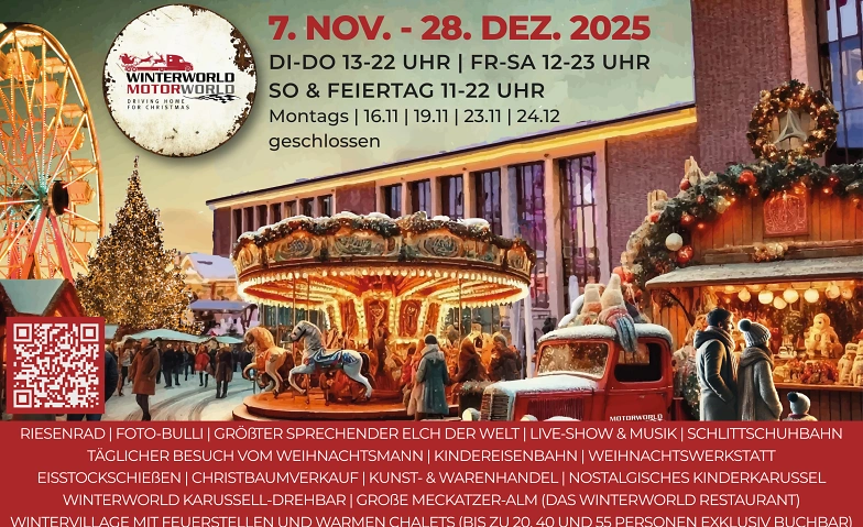 Bereits im dritten Jahr erstrahlt die Motorworld München in vollem Lichterglanz: Die WinterWorld verwandelt das Areal in ein zauberhaftes Winterwunderland, in dem funkelnde Automobile, duftende Tannenzweige und glitzernde Lichter zu einer festlichen Kulisse verschmelzen. Das romantische Riesenrad bietet eine märchenhafte Aussicht über das leuchtende Ensemble, während auf der Kindereisenbahn, der Eisbahn und der Eisstockbahn fröhliche Bewegung und gemeinsames Lachen den Wintertag verzaubern. Ein besonderes Highlight ist der tägliche Besuch des Weihnachtsmanns in seiner liebevoll gestalteten Werkstatt. Kinder dürfen ihm Lieder vorsingen, Gedichte aufsagen oder ihre Wünsche verraten – ein magischer Moment, der Herzen höherschlagen lässt. Der Kunst- und Warenmarkt lädt zum Stöbern und Staunen ein. Zudem erwarten die Besucher kulinarische Genüsse – meist von Münchner Unternehmen –, von herzhaften Schmankerln über süße Versuchungen bis hin zu wärmenden Getränken. Perfekt, um den Winterzauber mit allen Sinnen zu genießen. Für stimmungsvolle Unterhaltung sorgt täglich Live-Musik, die das WinterVillage in festliche Klänge hüllt und jedem Besuch eine besondere Note verleiht. In der urigen Motorworld Alm by Meckatzer genießen Besucher deftige Spezialitäten in geselliger Atmosphäre. Sowohl die Alm als auch exklusive Chalets können für Gruppen und Familienfeiern gebucht werden – für 20, 40, 60 oder bis zu 150 Personen. Ein Ort voller Lichter, Düfte und Freude – die Winterworld an der Motorworld München lädt dazu ein, den Zauber der Weihnachtszeit in all seinen Facetten zu erleben.
