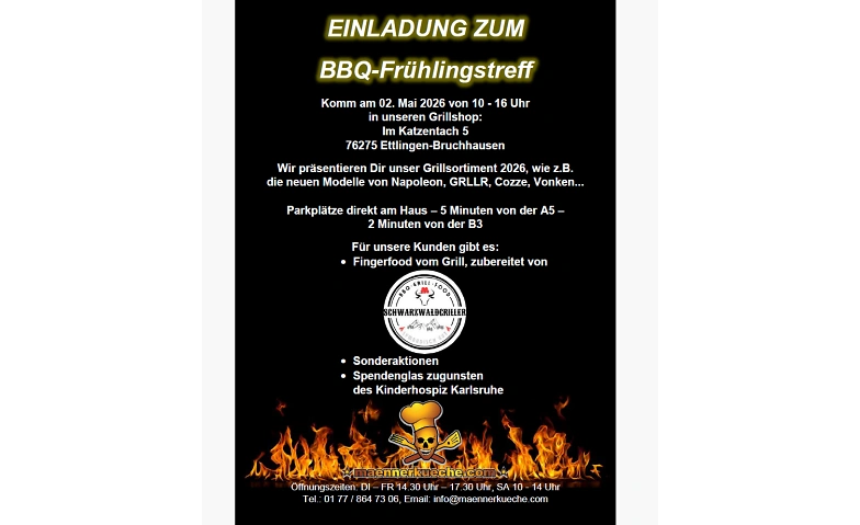 Auch dieses Jahr lädt die Firma maennerkueche.com wieder zu ihrem BBQ-Frühlingstreff ein. Nachdem im vergangenen Jahr zahlreiche Besucher den Weg nach Ettlingen-Bruchhausen gefunden haben, hat man sich dazu entschlossen auch dieses Jahr eine Veranstaltung durchzuführen. Am 02. Mai 2026 können die Besucher vor allem die Neuheiten aus dem Sortiment des Grillshops begutachten. Es erwartet Sie die neuen Gasgrills von Napoleon, wie z.B. die neuen Napoleon Freestyle und Prestige-PRO Modelle. Oder auch die modulare Außenküche der Firma GRLLR, die es aktuell in Deutschland exklusiv nur bei der Männerküche gibt. Außerdem findet man jetzt in den Ausstellungsräumen neben den Pizzaöfen auch Gasgrills von Cozze, wie z.B. die Element Plancha. Ebenfalls neu sind die hochwertigen und von Hand gefertigten Holzöfen der Firma Vonken. Außerdem findet man auch Räucherschränke in den Ausstellungsräumen, die beliebten Pizzaöfen von Ooni sowie den mattschwarzen Keramikgrill aus dem Hause GRLLR und jede Menge Grillzubehör wie z.B. Grillthermometer, Küchenmesser, Pizzasteine, Gusstöpfe und noch mehr. Kunden der ersten Stunde sind bis heute treu und wissen die persönliche Beratung zu schätzen.