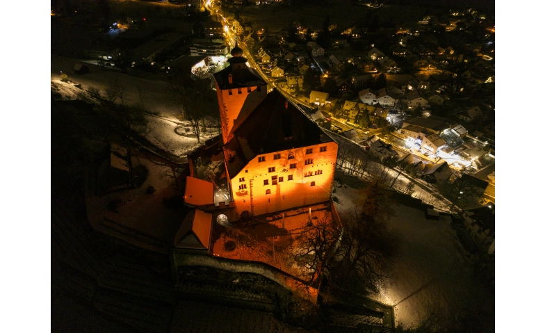 Vom Internationalen Tag gegen Gewalt an Frauen bis zum Tag der Menschenrechte leuchtet das Schloss in orangem Licht.