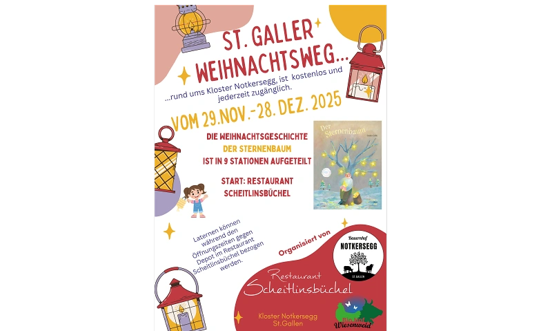 Der St.Galler Weihnachtsweg erzählt die Weihnachtsgeschichte "Der Sternenbaum" von Gisela Cölle. Der Weg führt rund um das Kloster Notkersegg und ist in 9 Stationen aufgeteilt.