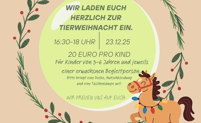 Das Programm findet für Kinder im Alter von 3-6 Jahren am 23.12.2025 von 16.30 Uhr-18 Uhr auf unserem Hof statt. Jedes Kind kann eine erwachsene Begleitperson mitbringen. Für die erwachsene Begleitperson wird kein wieteres Ticket benötigt.