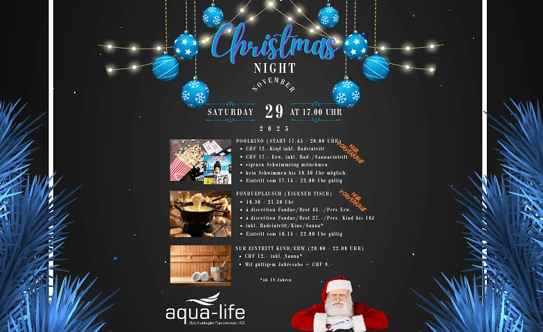 Am Samstag, 29.11.2025 verwandelt sich das Aqua-Life von 16.30 bis 22.00 Uhr erneut in eine festliche Weihnachts-Oase für Gross und Klein. Euch erwarten Kerzenlicht, stimmungsvolle Dekoration und ein entspannender Whirlpool.