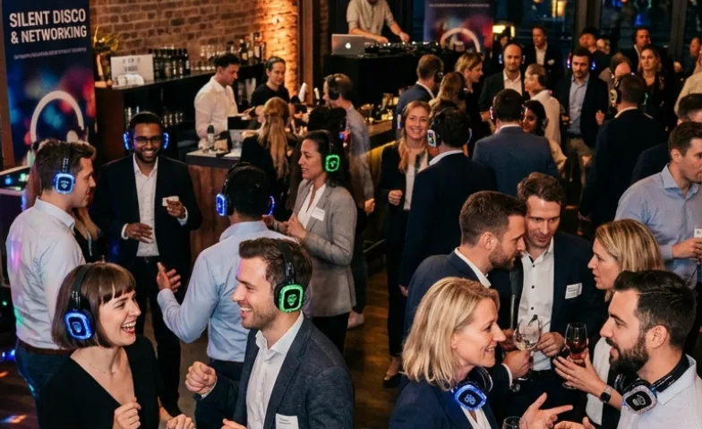 Whisper & Work verbindet zwei Dinge, die eigentlich nicht zusammenpassen: eine Silent Disco und ein Networking-Event. Das Ergebnis ist überraschend einfach — wer feiern will, setzt die Kopfhörer auf. Wer reden will, nimmt sie ab. Jeder gestaltet seinen Abend selbst.