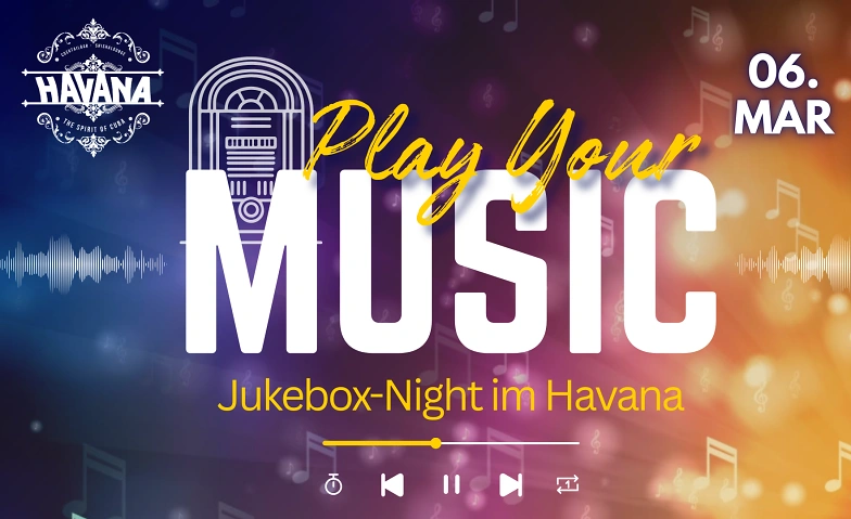 Unter dem Motto "Play your Music – Jukebox-Night im Havana" entscheiden nicht wir, was läuft, sondern die Crowd. Egal ob Oldschool Hip-Hop, aktuelle Charts oder eure liebsten Party-Hymnen – wenn ihr und eure Freunde es hören wollt, dann läuft es auch!