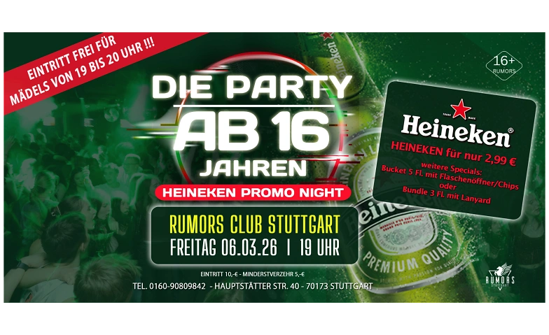 Heineken Promo-Party (ab 16 Jahren) Rumors Club Stuttgart, Hauptstätter Straße 40, 70173 Stuttgart Tickets