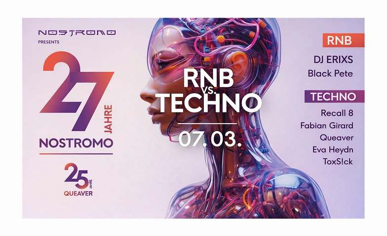 Samstag den 07.03. erwartet euch eine unvergessliche Nacht im Nostromo. Seid dabei, wenn sich die besten Sounds aus verschiedenen Musikrichtungen vereinen. Auf zwei Floors könnt ihr euch auf mitreißende RnB-Beats und treibenden Techno freuen. Erlebt die Energie und Vielfalt der Musikszene, während talentierte Acts die Menge in Ekstase versetzen. Feiert mit uns eine Nacht voller Rhythmus, Leidenschaft und unvergesslicher Momente! Seid am Start und lasst euch von den besten Sounds der Stadt verzaubern!
