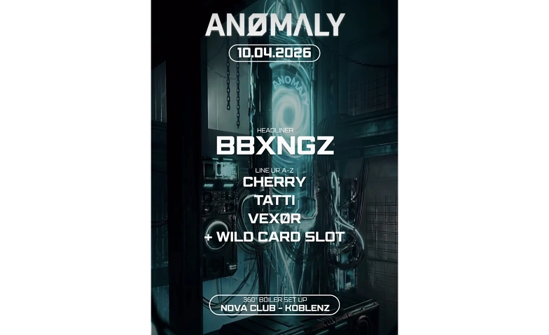 April 10 — ANØMALY returns to Nova Club Koblenz. ANØMALY stands for raw energy, close interaction, and a room that works as one. For this edition, the space and stage are redesigned to reduce distance and increase impact. The lineup brings strong individual energy, distinct sound identities, and a stage presence that feeds directly into the crowd. No filler, no repetition — every artist adds pressure. This one is mandatory.