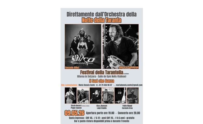 Dai ritmi travolgenti dell’Orchestra della Notte della Taranta, arriva in Vallese il Festival della Tarantella, 2a edizione, con l'evento Sud che Danza. Vivi una serata di musica e danza tradizionale che celebra il cuore pulsante del Sud Italia.