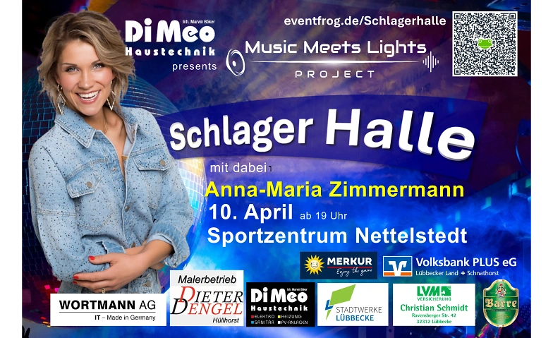 Bereit für eine Nacht voller Ohrwürmer, Tanz und guter Laune? Dann schnallt euch an, denn am 10. April 2026 verwandelt sich das Sportzentrum Nettelstedt in die heißeste Schlager-Party des Jahres! Mit der unnachahmlichen Schlagerqueen Anna-Maria Zimmermann und dem funky DJ-Team „Music Meets Lights Project“ wird die Hüfte garantiert zum Schwingen gebracht.
