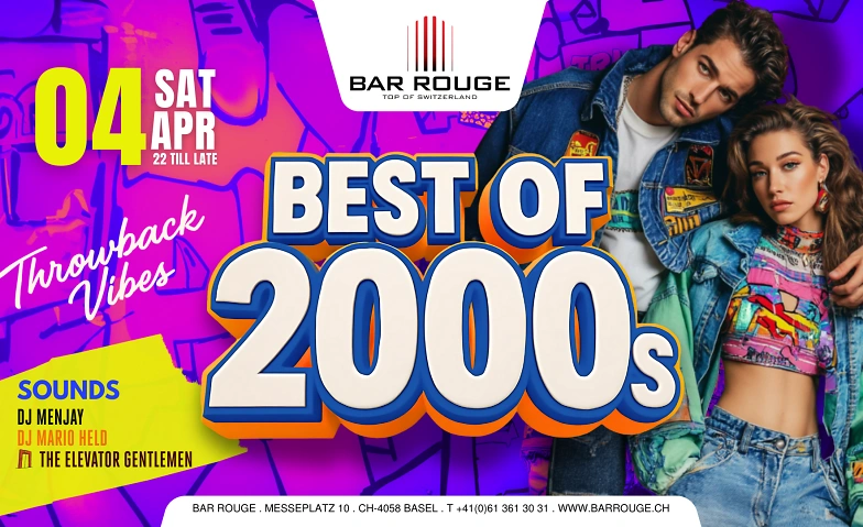 Geniesse auf 105 Metern Höhe trendige Cocktails von stylishen Bartendern und bestaune den atemberaubenden Blick auf Basel. Tanze auf zwei Floors zu Club Classics, RnB, Latin und angesagten Charts im 31. Stock oder tauche im 30. Stock ein in die Ära von Hits wie Britney Spears' "Toxic", OutKast's "Hey Ya!", Rihanna's "Umbrella" und Lady Gaga's "Poker Face". Komm zur Best of 2000 Party, bring deine Freunde mit, zeig uns deine angesagtesten Dance Moves und geniesse eine unvergessliche Nacht. Join the club!
