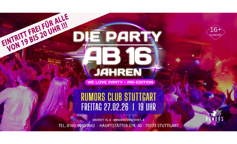 👉 Los geht’s um 19 Uhr für alle Stuttgarter Szene- und Partygänger ab 16 und bis 20 Uhr ist für alle Gäste der EINTRITI FREI - also frühzeitig kommen. Bekanntlich wird die Schlange ab 19:30 Uhr sehr lang!