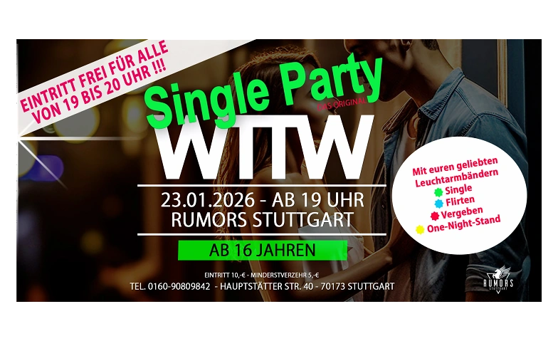 WTTW (ab 16 Jahren) - Single Party (Das Orginal!) Rumors Club Stuttgart, Hauptstätter Straße 40, 70173 Stuttgart Tickets
