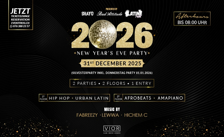 Die Silvester Party des Jahres steht unmittelbar bevor, und Bad Attitude, Shayo & Latin Fäscht lädt dich herzlich dazu ein, das alte Jahr zu verabschieden und das neue Jahr mit einem Knall zu begrüßen! Dieses Jahr versprechen wir eine unvergessliche Nacht voller Spaß, Musik und aufregender Überraschungen. Du liebst Hiphop? Latin? Oder doch Afrobeats & Amapiano? Dann bist du bei uns genau Richtig! Wir feiern über 10 Stunden ab 22:00 Uhr auf 2 Floors bis 08:00 Uhr im Herzen von Zürich und verwöhnen dich mit den besten Music Hits.