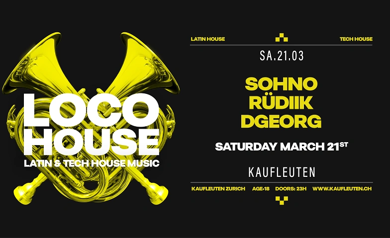 Willkommen bei Loco House, wo heisse Latin-Rhythmen auf elektronische Beats treffen und das Kaufleuten in einen brodelnden Dancefloor verwandeln! Hier gibt’s keine halben Sachen – nur pure Energie, treibende Klänge und ein Sound, der dich nicht stillstehen lässt. Unsere DJs nehmen dich mit auf eine musikalische Reise, die dich von Latin House über Afro-Tech bis hin zu Tribal Sounds trägt. Der Bass pumpt, die Vibes sind elektrisierend, und du spürst: Diese Nacht wird LOCO. Mach dich bereit für eine Nacht voller Feuer, Tempo und unwiderstehlicher Vibes. Ob du zu treibenden Latin-Sounds tanzt oder dich den elektrisierenden Beats hingibst – Loco House verbindet das Beste aus beiden Welten und bringt das Kaufleuten zum Beben. Schliess die Augen, fühl den Beat und tanz, bis der Morgen kommt – im Kaufleuten wird es heisser als der Sommer!