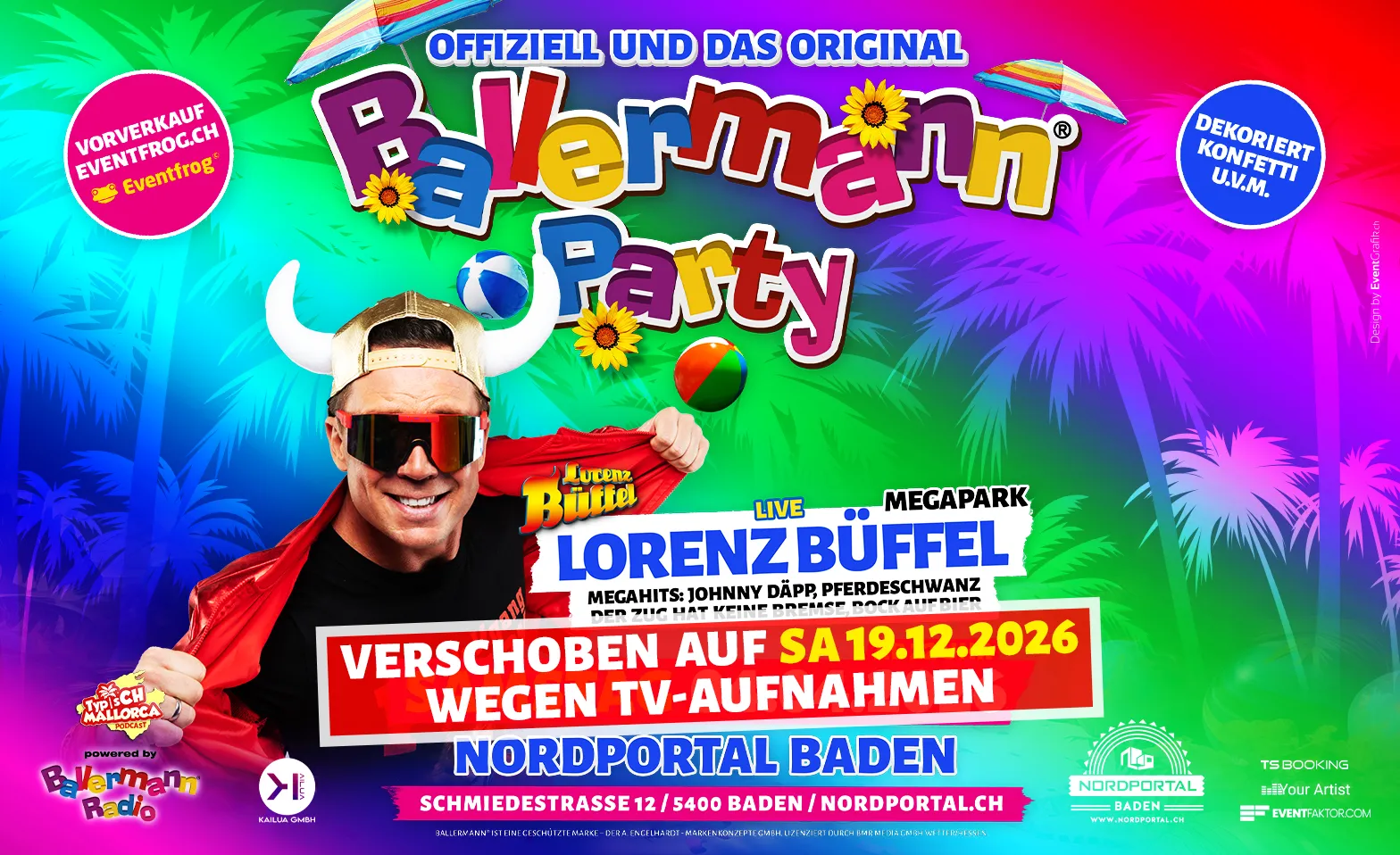 Am Samstag, 4. April 2026 heisst es wieder: Konfetti, Deko und Abriss-Stimmung wie am Bierkönig & Megapark. Sonne im Herzen, Party auf der Tanzfläche – und das mitten in der Schweiz! ☀️💃