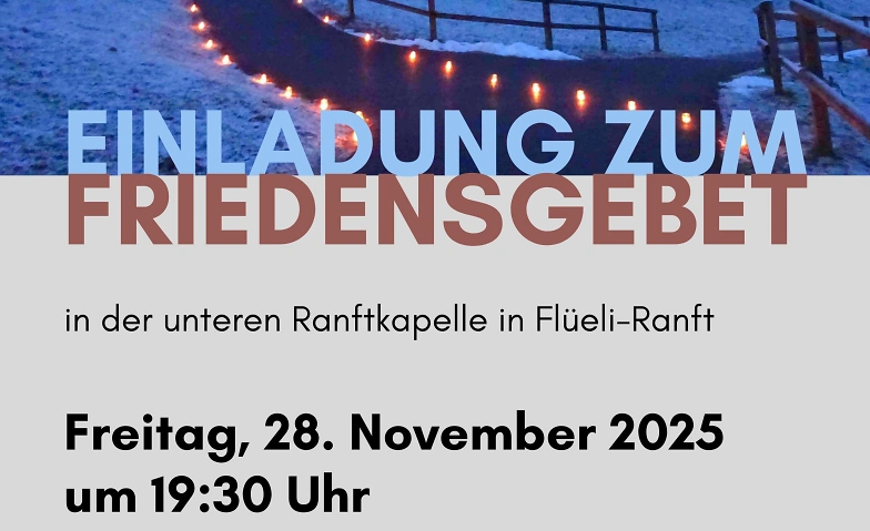 Zu unserem dritten Rise Up-Gottesdienst laden wir euch herzlich ein: Am Freitag, 28. November, machen wir uns individuell auf den Weg ins Flüeli. Von dort geht jede und jeder für sich den Lichterweg hinunter zur unteren Ranftkapelle, wo wir uns um 19:30 Uhr versammeln, um im Sinn von Bruder Klaus für den Frieden bei uns und in der Welt zu beten.