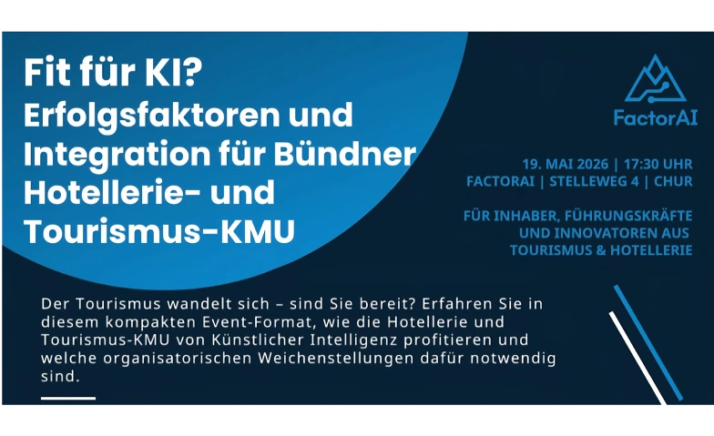 - 17:30 Uhr | Begrüssung & Moderation - Sebastian Früh (Initiator & Head of Ecosystems, FactorAI) Einleitung in das Ökosystem der FactorAI und die Relevanz von KI im Bündnerland.