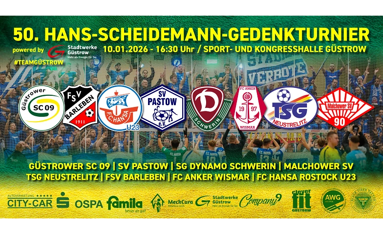 Am 10. Januar 2026 verwandelt sich die Sport- und Kongresshalle Güstrow erneut in eine Bühne für packenden Hallenfußball, wenn das Hans-Scheidemann-Gedenkturnier zum 50. Mal ausgetragen wird. Was 1976 als ehrendes Andenken an den engagierten Sportfunktionär Hans Scheidemann begann, hat sich über fünf Jahrzehnte hinweg zu einem der bedeutendsten Hallenturniere Norddeutschlands entwickelt.