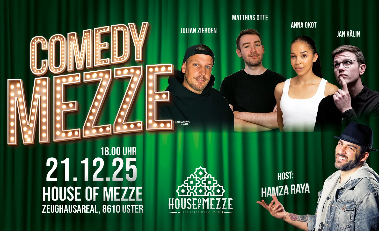 Lach dich schlapp bei unserer Jubiläums-Edition von Comedy Mezze und geniesse dazu köstliche Mezze! Dich erwartet ein Abend voller Spass, Genuss und herrlich guter Unterhaltung – und gleichzeitig verabschieden wir uns von einer einzigartigen Location, die wir ein letztes Mal zum Leben erwecken.