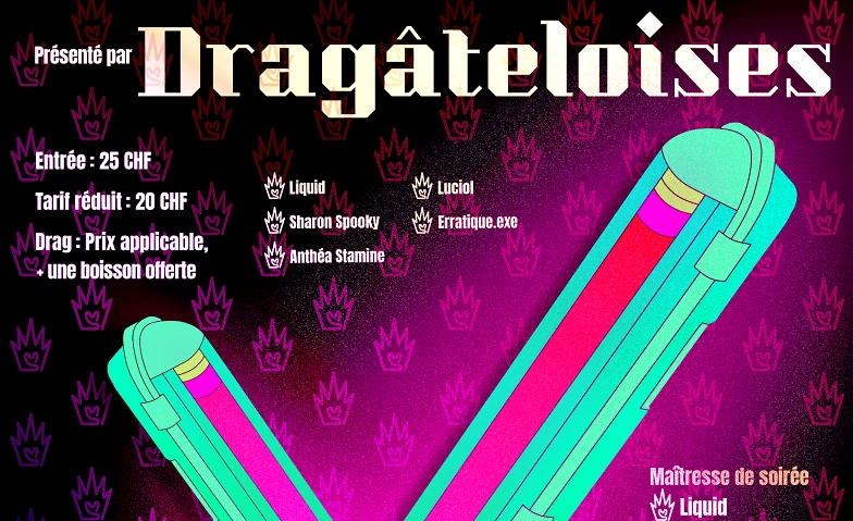 On dit de l’art drag qu’il est éblouissant, cette édition le sera littéralement ! Effet lumineux, stroboscopes et autres surprises illumineront Peseux le temps d’une soirée luminescente. Cette édition sera présentée par Liquid, qui performera aux côtés de Sharon Spooky, Anthéa Stamine, Erratique.exe et Luciol.