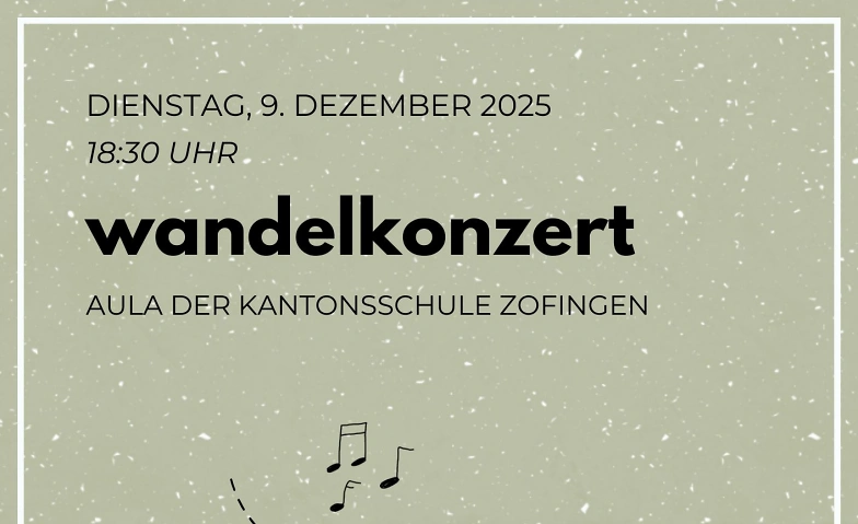 Wieder einmal ist es soweit: Die Kanti Zofingen zeigt ihre musikalischen Leckerbissen als Wandelkonzert. Die Besucher werden im ganzen Schulhaus umherwandeln und sich an den verschiedensten Orten im Schulhaus die einzelnen Beiträge zu Gemüte führen können. Neben vielen pianistischen Beiträgen, gibt es auch ein Streichquartett, Jazzformationen und vieles mehr. Es lohnt sich zu kommen. Der gemeinsame Start findet in der Aula (ZU26) statt.