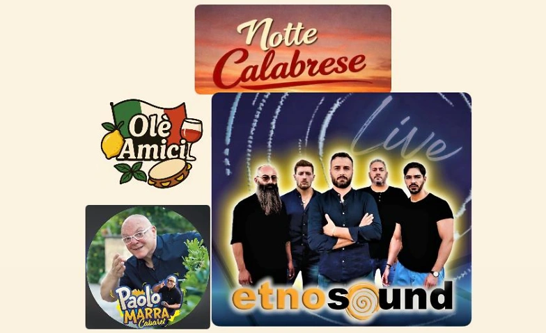 Für den musikalischen Höhepunkt sorgt die Gruppe EtnoSound, die mit mitreissenden Klängen Tradition und Moderne verbindet und das süditalienische Lebensgefühl auf die Bühne bringt. Als Special Guest wird Paolo Marra mit Charme, Humor und bester Unterhaltung durch den Abend führen.