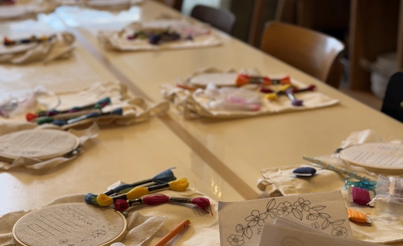 All the materials to embroidered a tote bag are also included, as well as a drink.