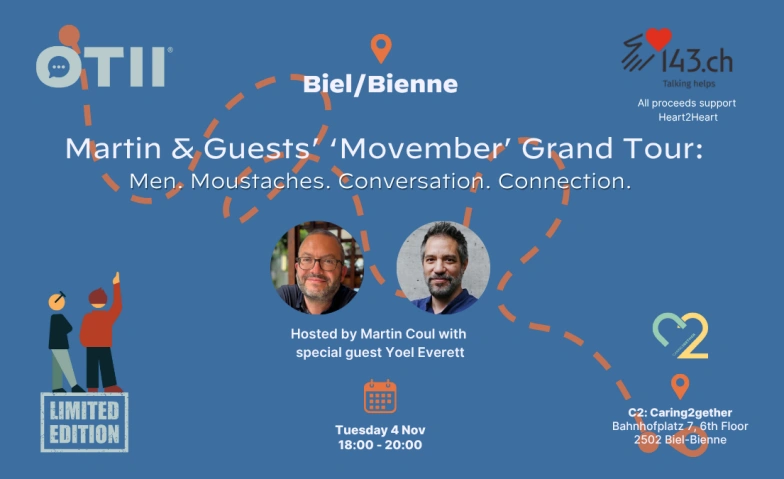 This Movember, Martin Coul brings his Grand Tour to Biel for an evening of open dialogue on men’s mental health. Losing a parent to schizophrenia as a young child, and later navigating his own experiences with depression and PTSD, shaped the lens through which Martin approaches well-being. Mental health chose him, not the other way around - and it’s why he’s committed to tackling the conversations many still shy away from. In Biel, Martin will be joined by a special guest to bring a fresh perspective to the conversation.