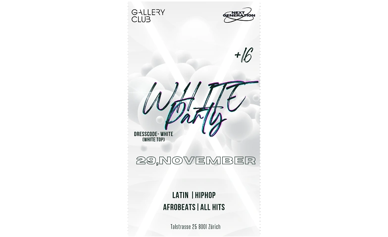 AM 29.November am Samstag findet unsere erste WHITE PARTY Ü16 im Gallery CLUB statt. Türöffnung um 23.00Uhr.