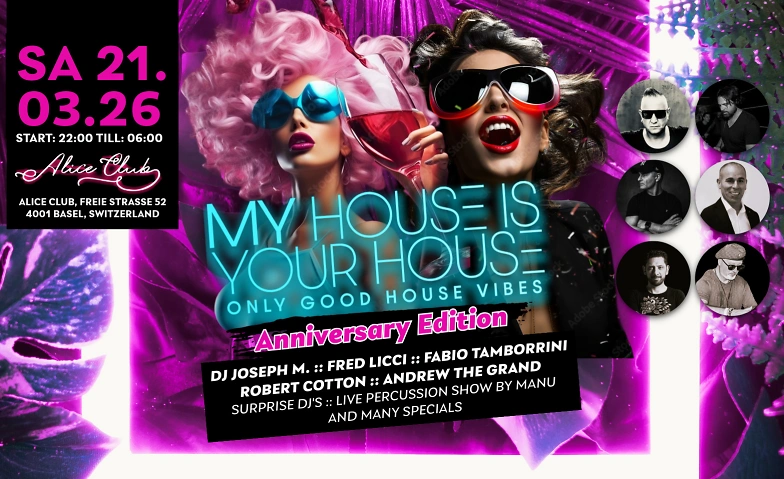 MY HOUSE IS YOUR HOUSE lädt am Samstag, 21. März 2026, zum grossen Anniversary Event in den renommierten Alice Club im Herzen von Basel ein. Die Eventreihe feiert sein 23. Jahres-Jubiläum in einen der stilvollsten Clubstandorte der Stadt. Zu diesem Anlass wird es von 22:00 Uhr bis 23:00 Uhr ein Welcome Cüpli und ein Apèro, Fingerfood & Snacks geben damit wir zusammen zum Jubiläum anstossen können.