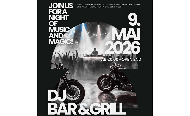 Am Samstag, 9. Mai 2026 verwandelt sich die Garage von Harley-Davidson Zürich in Rümlang in eine aussergewöhnliche Eventlocation. Dich erwartet eine Garage-Party mit DJ, Musik, Drinks und guter Stimmung, mitten in einer einzigartigen Motorradwerkstatt - Atmosphäre.
